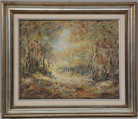 "Bosco" olio su tela (cm 40x50) firmato in basso a destra, controfirmato e datato 12/77 al retro, in cornice