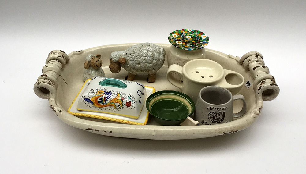 Lotto composto da vari oggetti in ceramica tra cui un vassoio biansato in maiolica