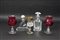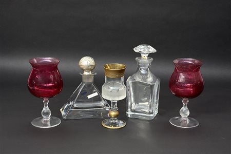 Lotto composto da due bottiglie da liquore in cristallo, una coppia di calici in vetro con coppe color vinaccio e un calice in cristallo con profili dorati (difetti)