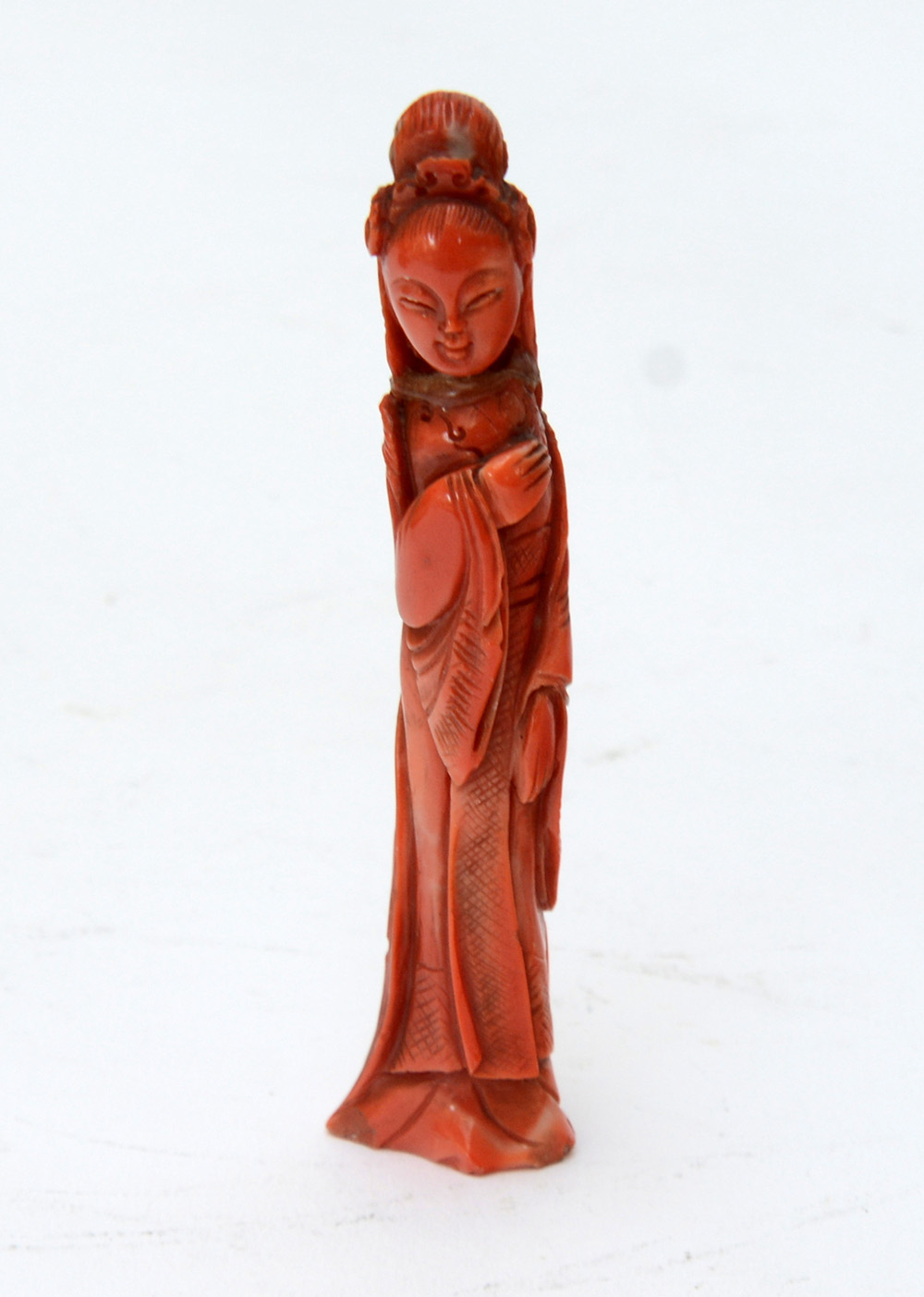 Scultura in corallo raffigurante donna dalle lunghe vesti (difetti, restauri...