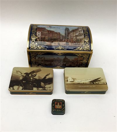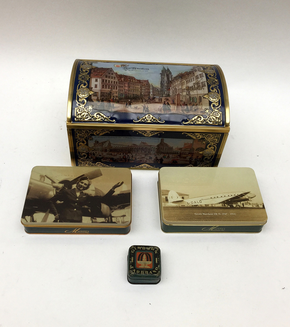 Lotto di quattro scatole in latta, una dell'inizio del secolo XX (difetti)