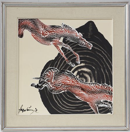 "Cavalli" tecnica mista su cartoncino (cm 58x58) firmata e datata 1972 in basso a sinistra, in cornice