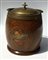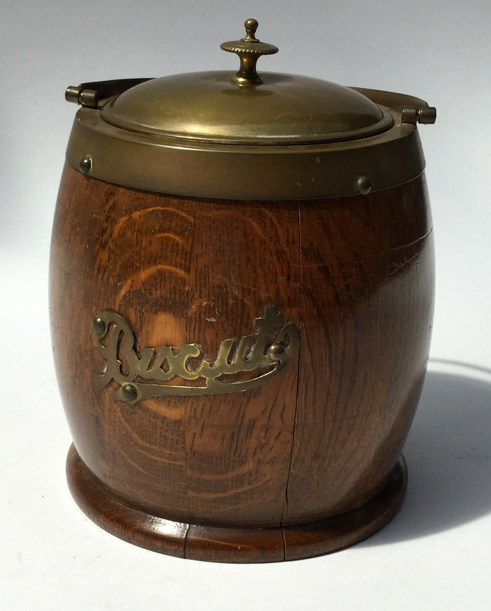 Scatola porta biscotti in legno con ghiere in metallo. Fine Sec XX