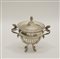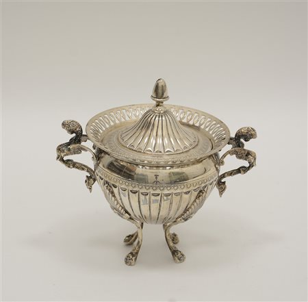 Zuccheriera con corpo baccellato, prese a tutto tondo in figura fantastica e quattro piedini con attacchi fogliato. Italia, metà secolo XX (g 260 ca.)
