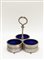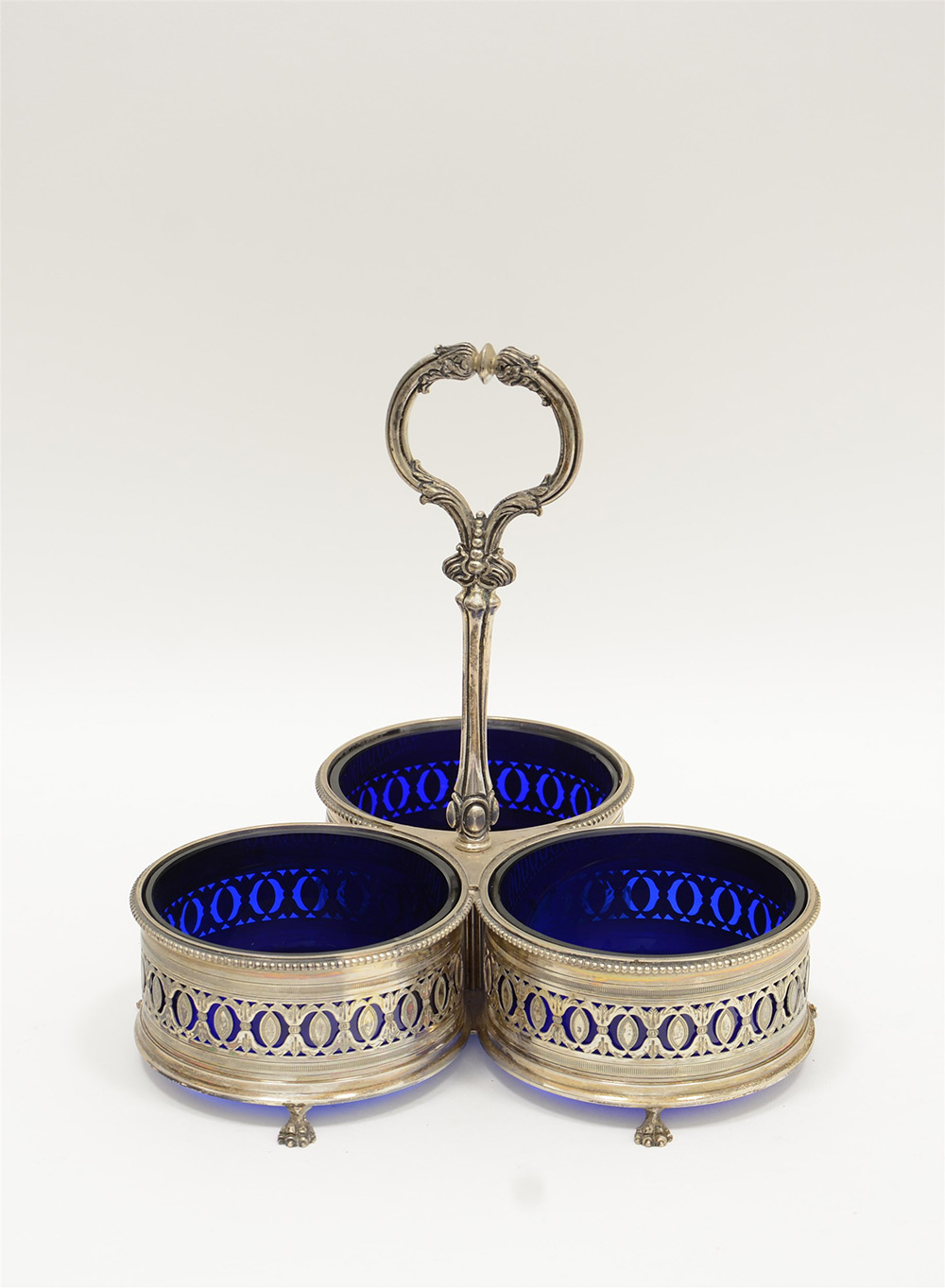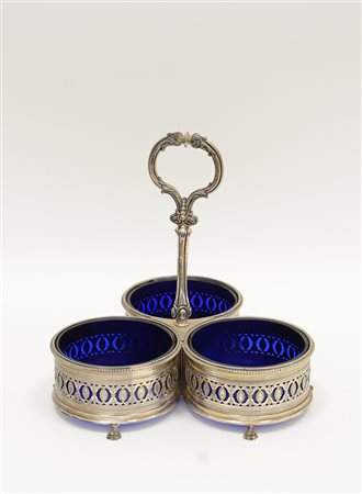 Set antipasto in argento con cestelli traforati e vaschette in vetro blu. Italia, secolo XX (h. cm 23) (g 700 ca.)