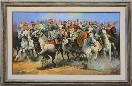 "La cavalcata dei Tartari" olio su tela (cm 70x120) firmato in basso a destra, controfirmato al retro e datato 1994, in cornice