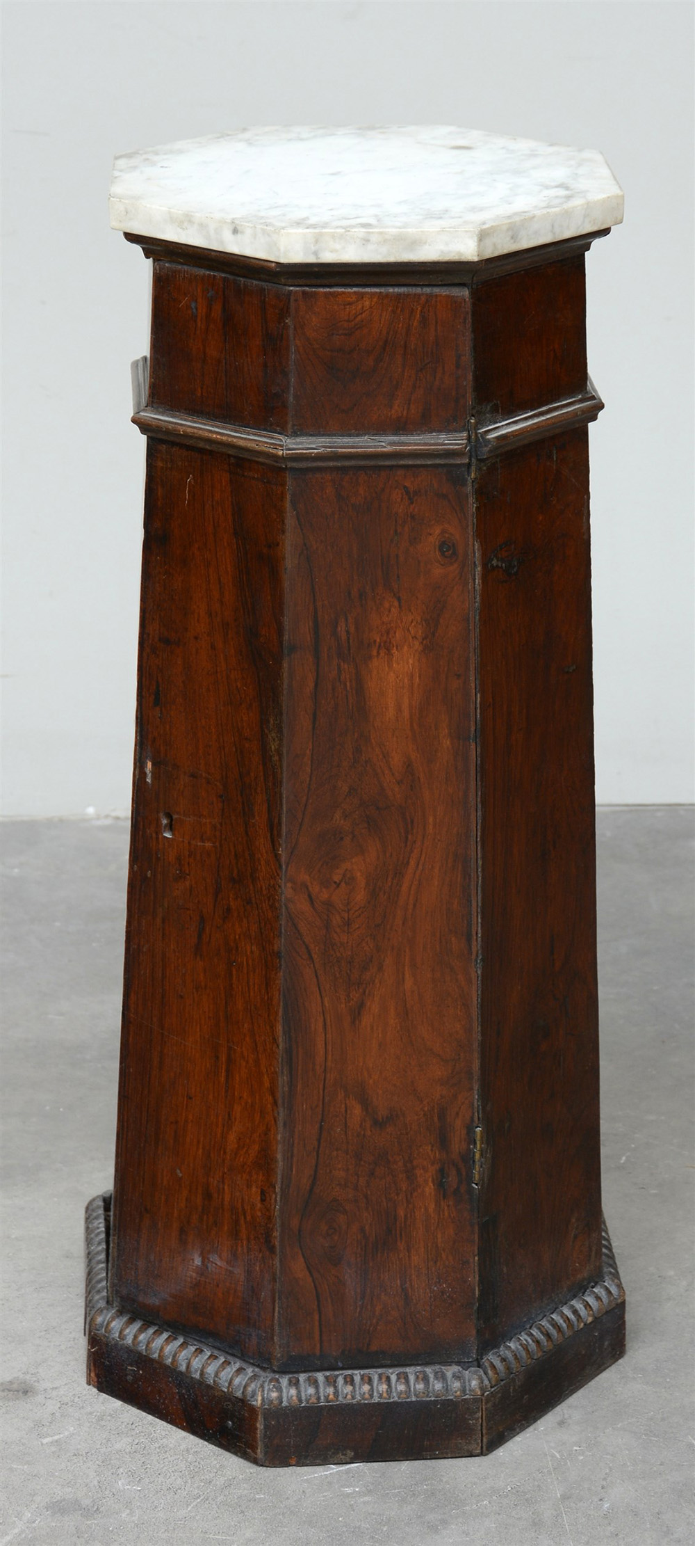 Colonna ottagonale in legno con anta apribile e piano in marmo bianco, secolo XIX (cm 40x78x40) (difetti)