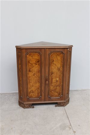 Schedario d'angolo impiallacciato in noce a due battenti radicati e filettati...