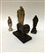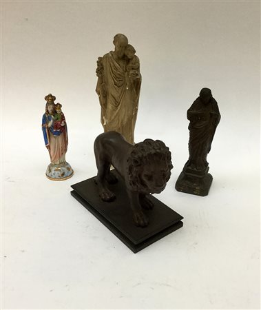 Lotto composto da quattro sculture in materiali diversi raffiguranti leone e figure sacre, misure differenti (difetti)