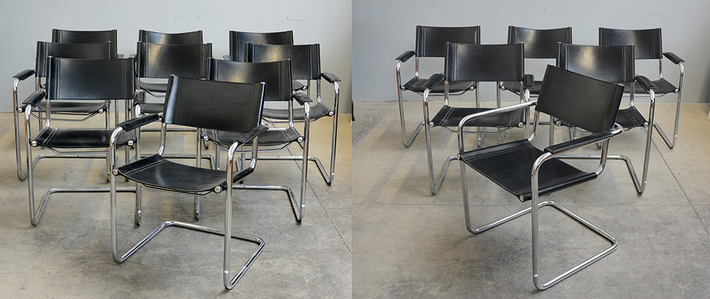 Lotto di ventiquattro poltroncine. Riedizione recente dal disegno di Mart Stam del 1926/27. Anni '70. Seduta e schienale in pelle nera e struttura in acciaio cromato. (cm 59x80x55) (difetti)