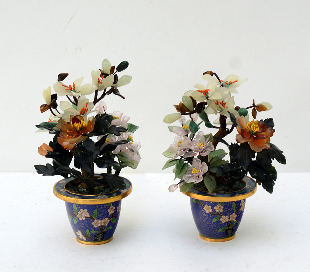 Coppia di vasi in metallo closionné con composizione floreale in pietre dure (difetti)