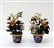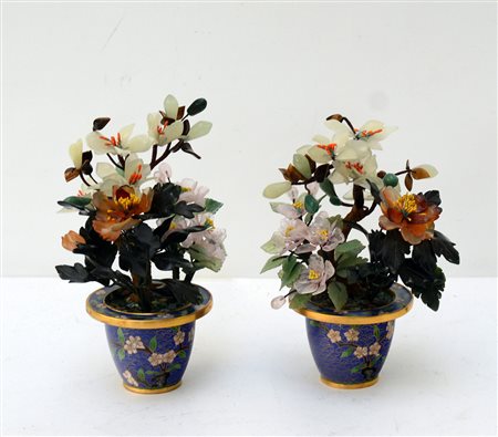 Coppia di vasi in metallo closionné con composizione floreale in pietre dure...