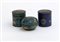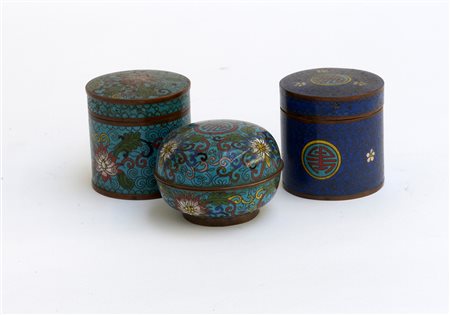 Tre scatole in metallo cloisonne con decoro floreale su fondo turchese e blu,...