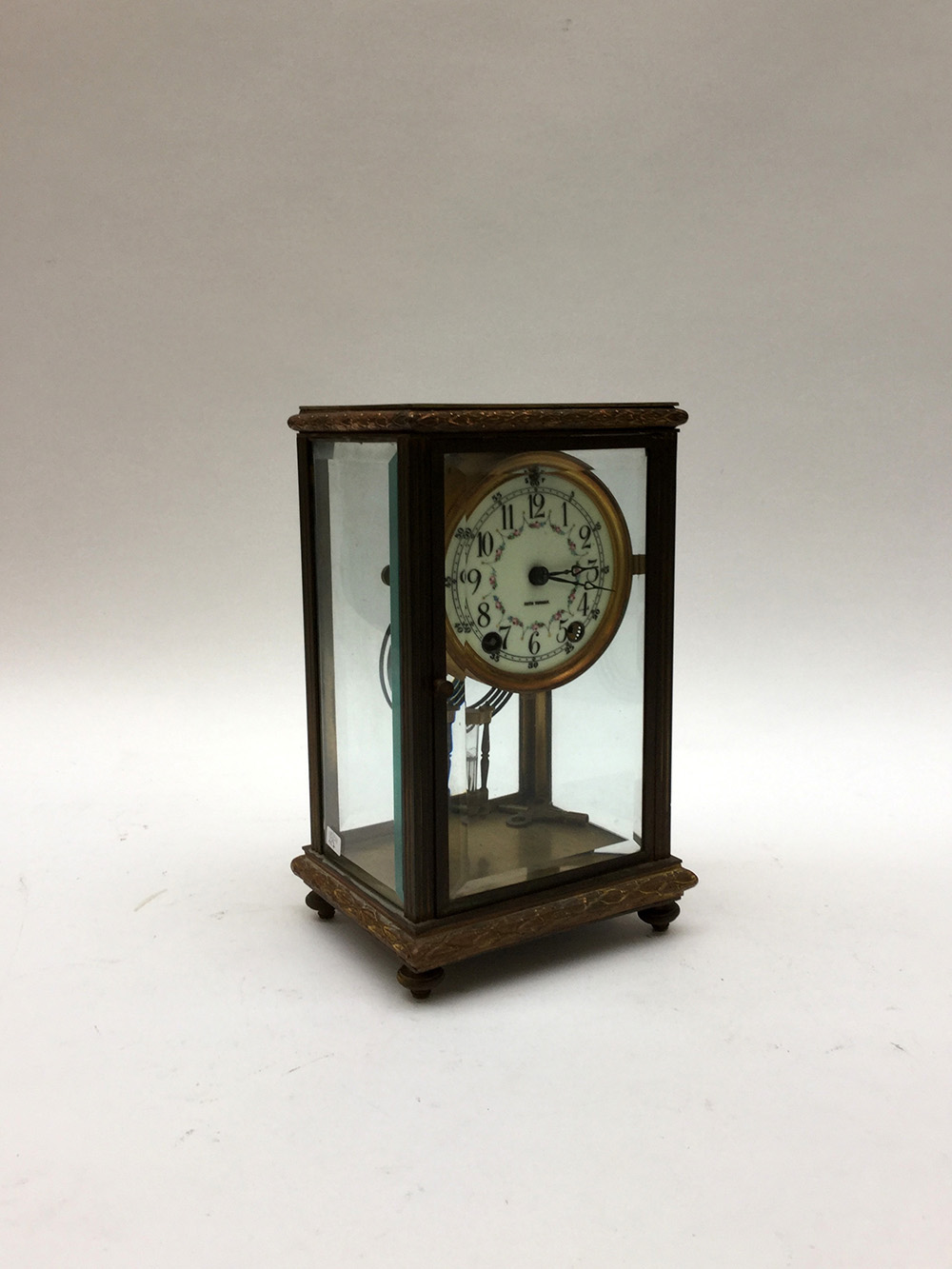 Pendola da tavolo in metallo e vetro con quadrante a numeri arabi decorato a festoni con fiori, movimento con carica settimanale suoneria delle ore e delle mezze su gong (cm 17x27x13)