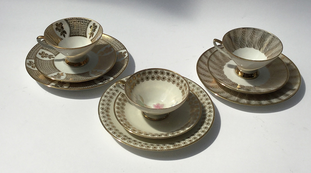 Lotto composto da tre tazzine, tre piattini e tre sottopiatti, manifattura tedesca in porcellana di diverso decoro