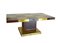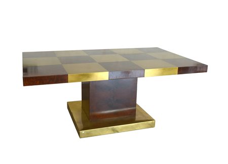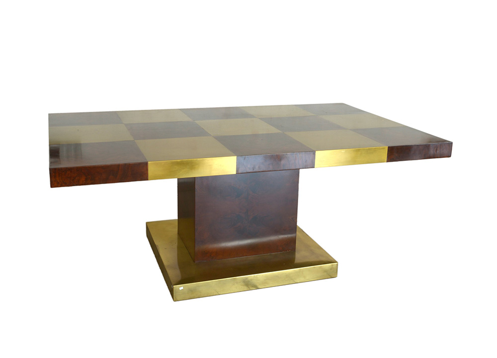 Tavolo da pranzo rivestito in radica composto da tre pezzi. Italia, seconda metà secolo XX. Gamba centrale in ottone e radica. (cm 175x73x111) (lievi difetti)