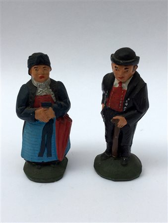 Coppia di personaggi popolari in terracotta decorata in policromia, Germania secolo XX (h cm 18)