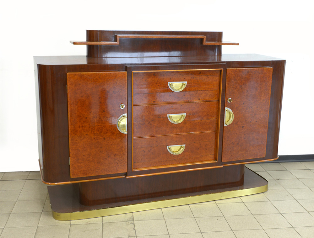 Credenza di gusto déco. Italia, seconda metà secolo XX. Struttura impiallacciata in legno di mogano e radica, tre cassetti nel comparto centrale e due ante laterali, maniglie a fascia in ottone. (cm 171x53x117,5) (lievi difetti e restauri)