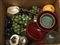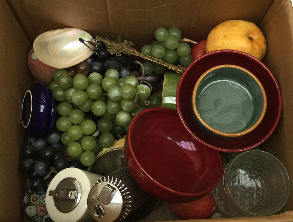 Cartone composto da numerosi oggetti diversi tra cui due accendini da tavolo, frutta finta, una cornice, un crocefisso ed altri, materiali differenti (difetti)