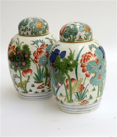 Manifattura di Cina. Coppia di potiches moderne in porcellana plicroma...