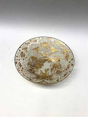 Piatto Rosenthal decorato con disegni in bianco e oro e a rilievo. Germania, 1976. Esemplare numerato 390/3000 di serie limitata.