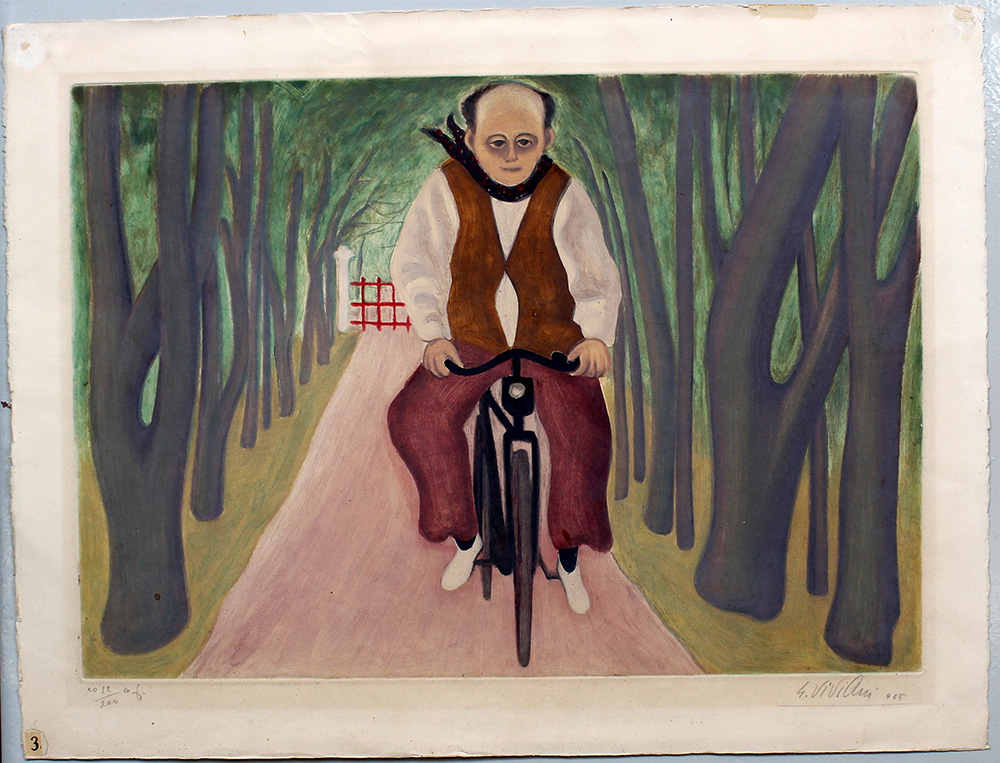 "Il ciclista" 1955, litografia a colori (foglio cm 50,4x66)numerata 12/200, firmata e datata in basso a matita (lievi difetti)