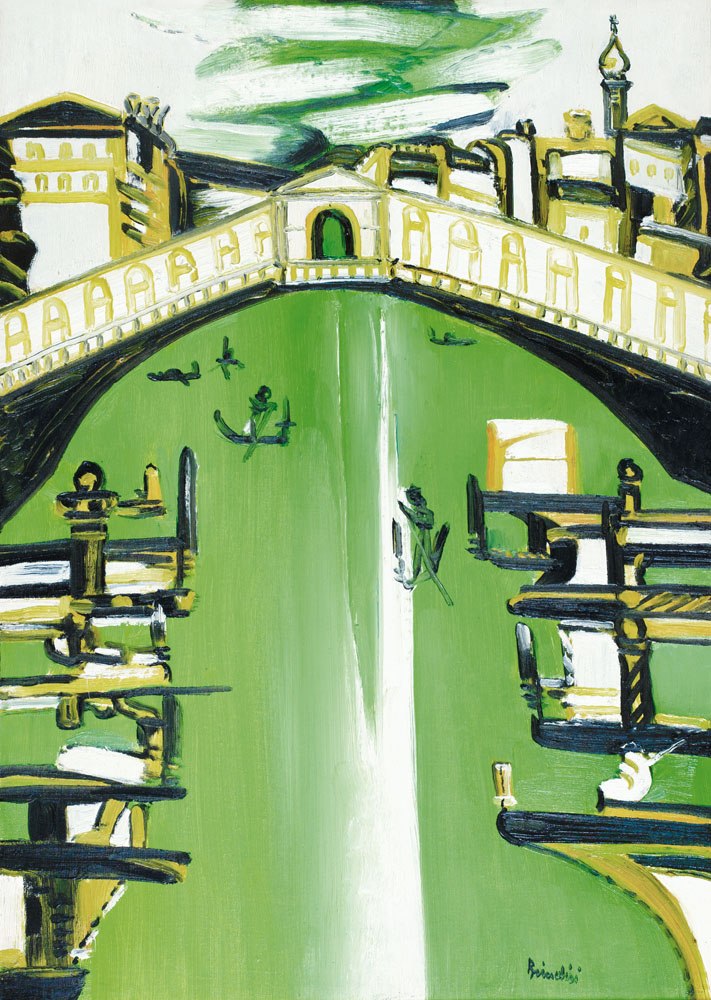 REMO BRINDISI Roma 25/04/1918 - Milano 25/07/1996 - Venezia Ponte di Rialto, 1967, olio su tela cm. 70x50, firma in basso a destra, dichiarazione d'autenticità dell'artista ed etichetta della Galleria Pace (MI) al retro, opera registrata presso l'Archivio Remo Brindisi come da dichiarazione a cura della Galleria d'Arte Pace (MI) su foto, pubblicato su "Remo Brindisi catalogo generale delle opere", volume II, Edizioni Galleria Pace (MI), rep. 3776, pagina 97 in bianco e nero e pagina 110 con tavola a colori.