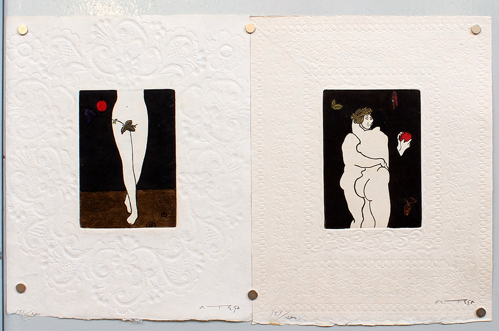 "Poemes Majeurs" 1975, con tre acqueforti stampate su carta goffrata a motivi floreali, firmate e numerate in basso a matita ad illustrazione di alcune poesie di Jean de la croix. Libro dedicato, datato e firmato sull'ultima pagina a matita. Si uniscono un pieghevole e un piccolo catalogo di mostre firmati e dedicati dall'artista.