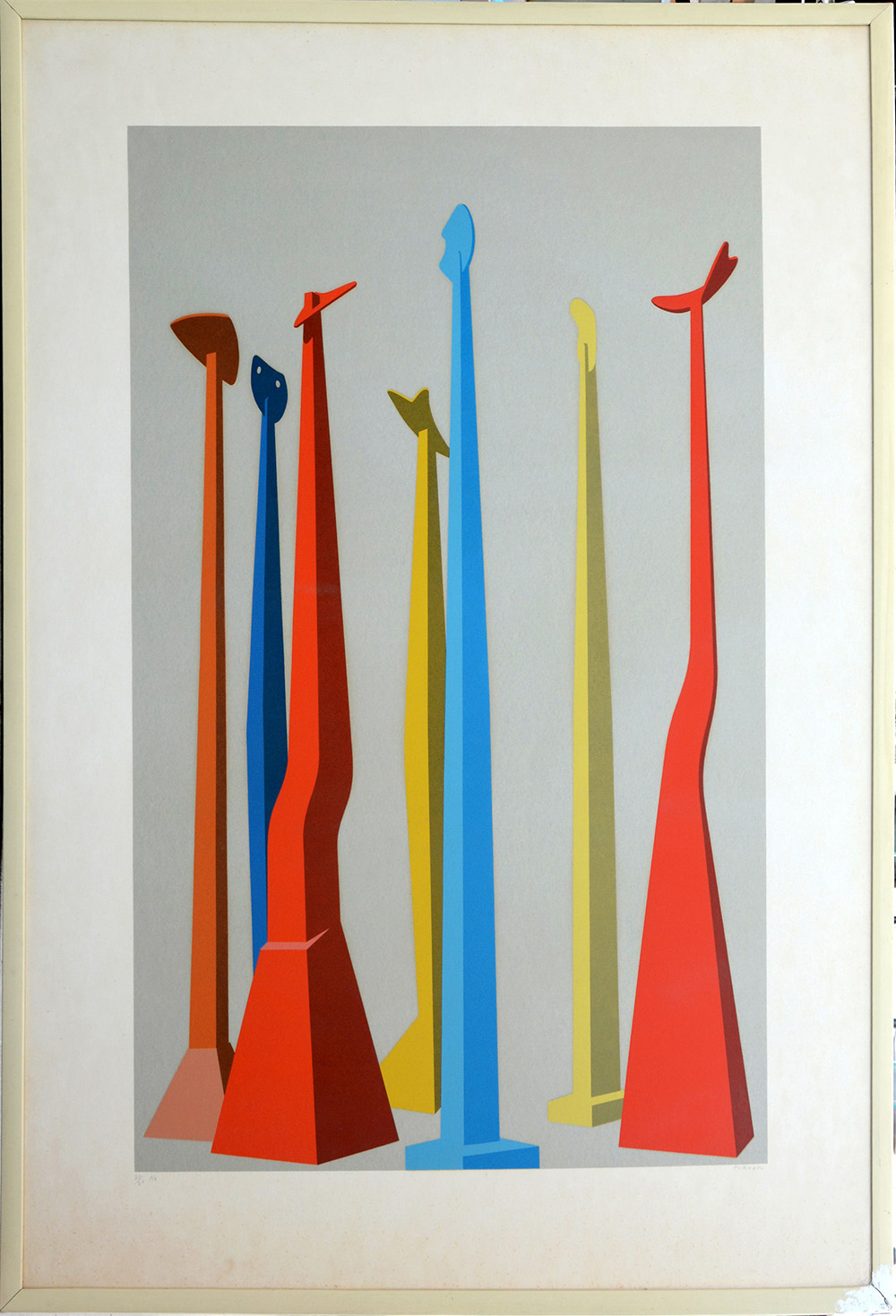 "Le Libertà" serigrafia - prova d'artista (foglio cm 140x99) numerata 20/20 e iscritta P/A a matita in basso a sinistra, firmata in basso a destra a matita. Timbro a secco in basso a sinistra "Grafiser Stamperia d'Arte, Roma", in cornice (lievi difetti)