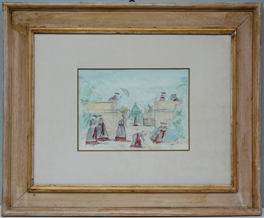 "Pretini in Vaticano" tecnica mista su carta (cm 25x35)firmata in basso al centro a matita, in cornice.