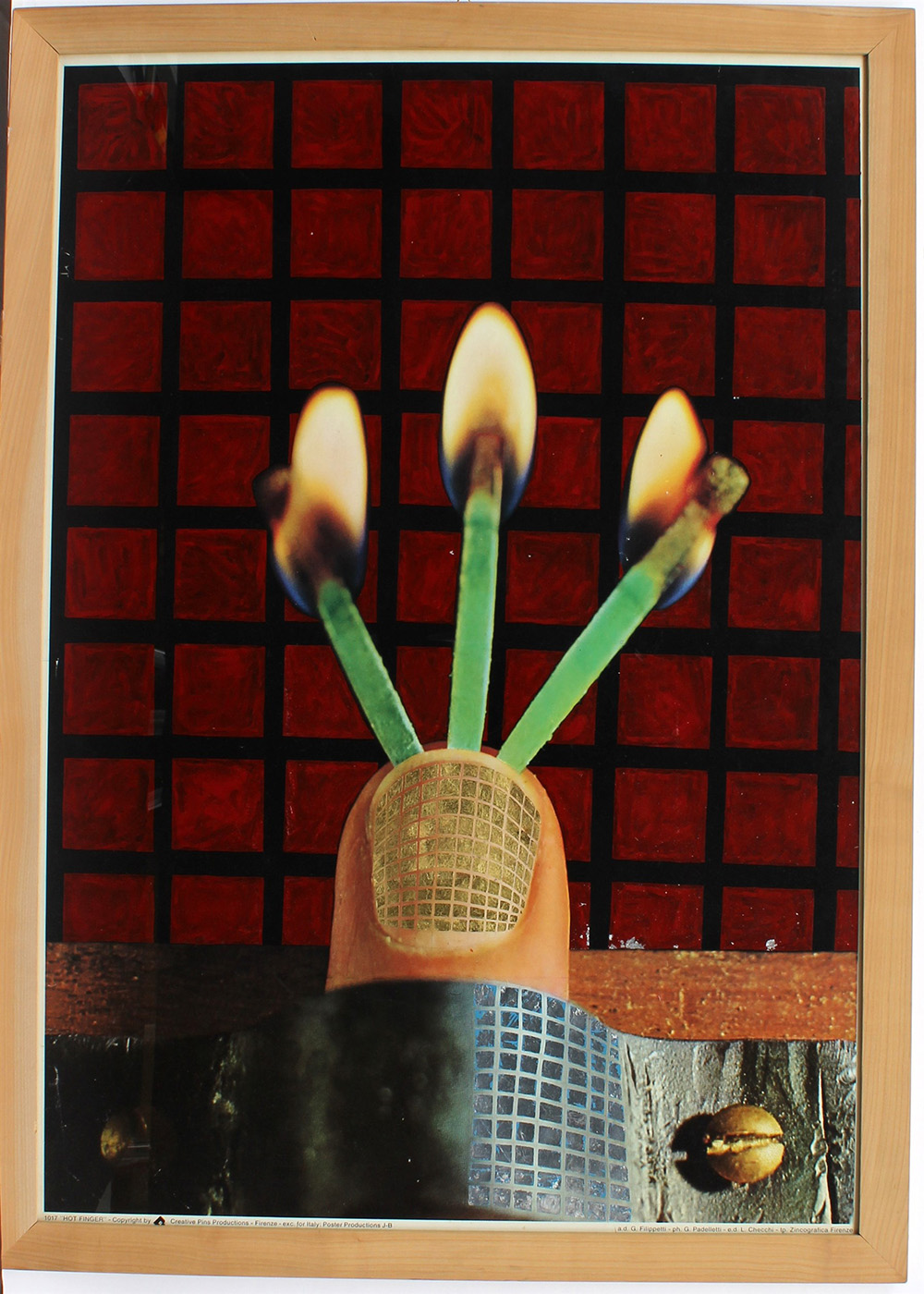 "Hot Finger" manifesto modificato con colore e foglia d'oro e argento e acrilici (cm 98x68), in cornice