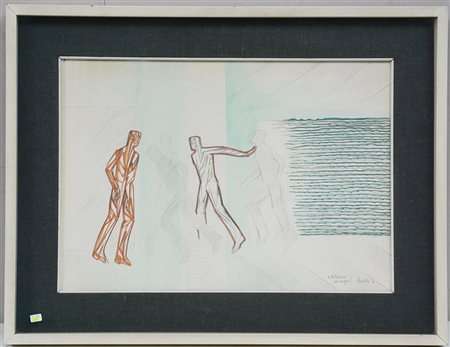 "Senza titolo" 1970, tecnica mista su carta intelata (cm 35x50). Dedicata, firmata e datata in basso a destra, firmata e datata in basso sul lato destro, in cornice (lievi difetti)