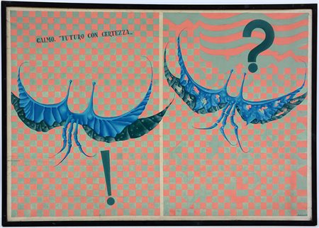 "Calmo, avvenire con certezza" 1965, dal ciclo "Una Vita", olio su tela (cm 70x100)firmato e datato in basso a destra. Titolato, datato e firmato al retro, in cornice (lievi difetti). Tracce di etichette e timbri al retro, uno della Galleria d'Arte 3A, Milano.