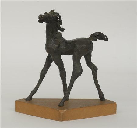 "Cavallo" scultura in bronzo su base in legno (cm 23x21). Firmata su una gamba. Opera autenticata sotto la base