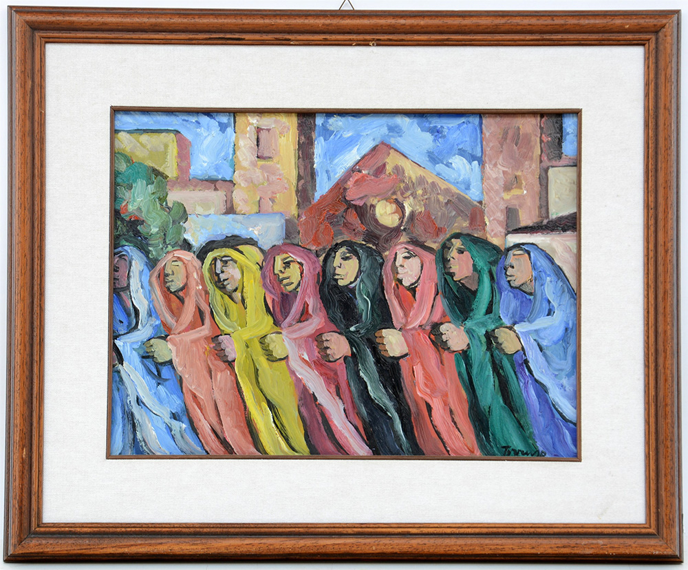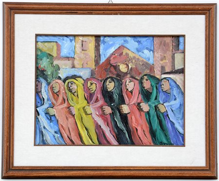 "Processione", olio su tavola (cm 30x40) Firmato in basso a destra. Firmato e titolato al retro. In cornice