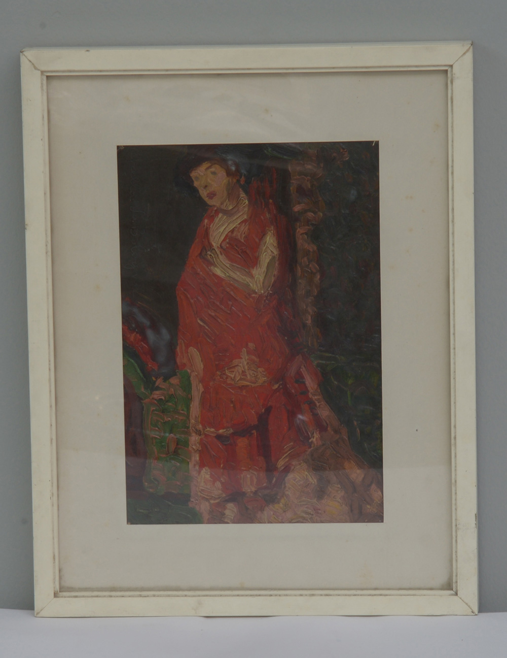 "Figura" olio su cartoncino (cm 27,5x19) firmato in alto sul lato sinistro, iscritto al retro, in cornice (lievi difetti)