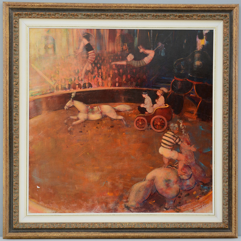 "Il Circo" olio su tela (cm 90x90) Firmato in basso, firmato al retro. In cornice