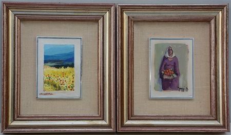 Lotto composto da due opere: Andrea Vaccaro "Campo di papaveri" 1982, olio su metallo (cm 16x11) Firmato in basso a sinistra. In cornice;