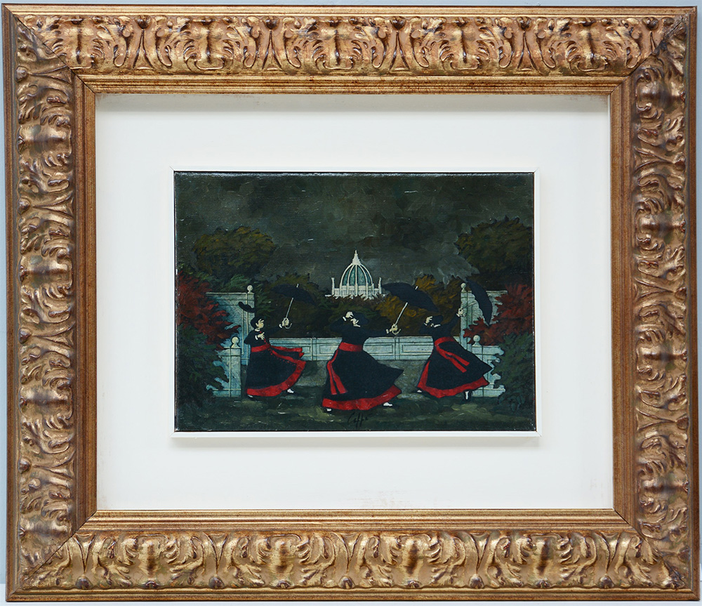 "Preti con ombrelli" olio su tela (cm 25x35) firmato in basso al centro, in cornice.