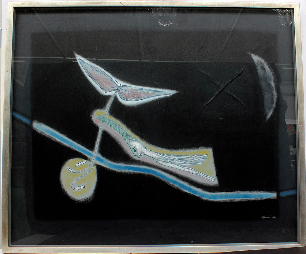 "Musica lontana per sentimenti raffinati" 1988, acrilici e tecnica mista materica su tela (cm 100x120) firmato e datato in basso a destra. Firmato, datato, titolato al retro, in cornice.
