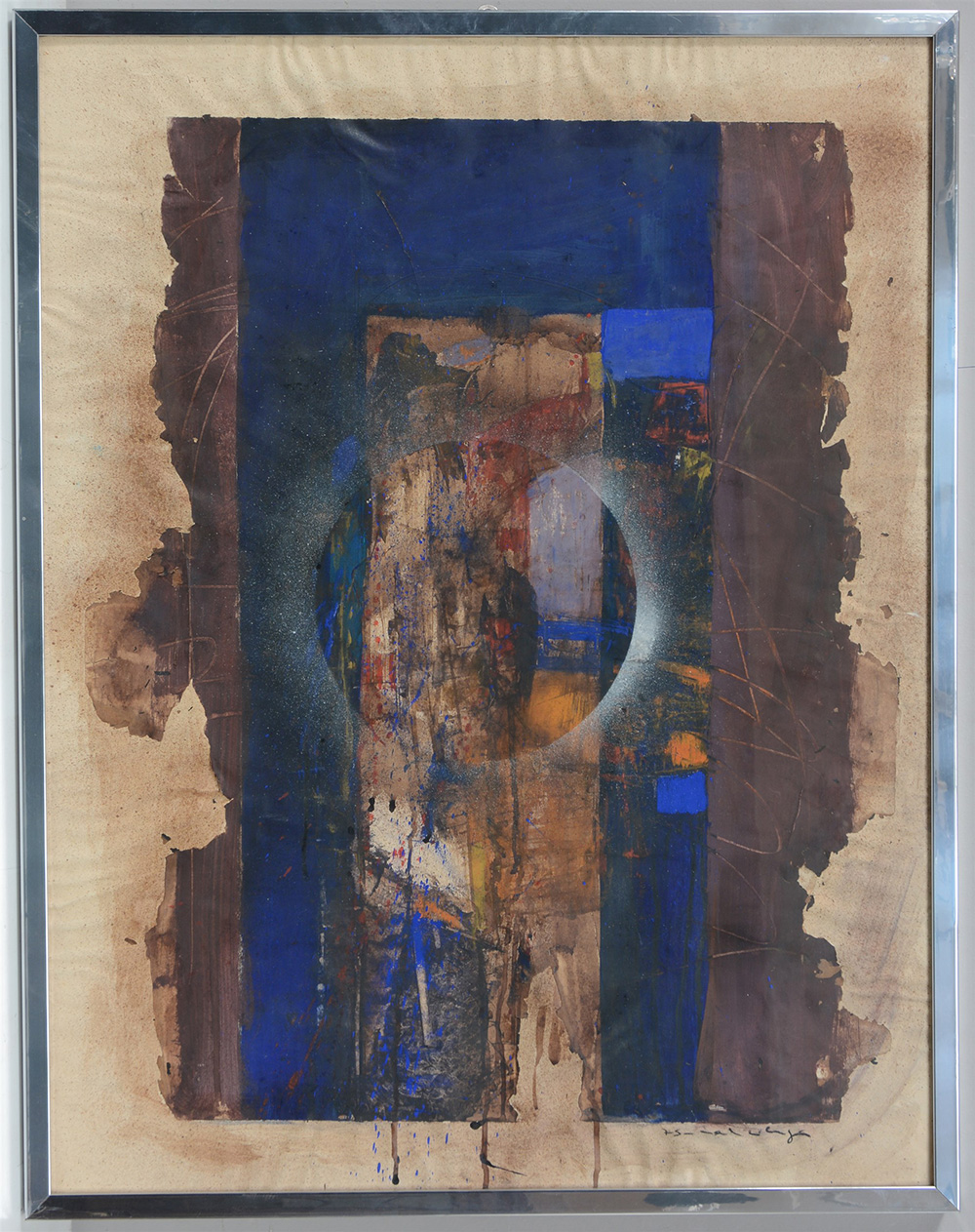 Firma indecifrata "Senza titolo" 1975, tecnica mista e collage su carta (cm 94x71) datato e firmato in basso a destra, in cornice (difetti)