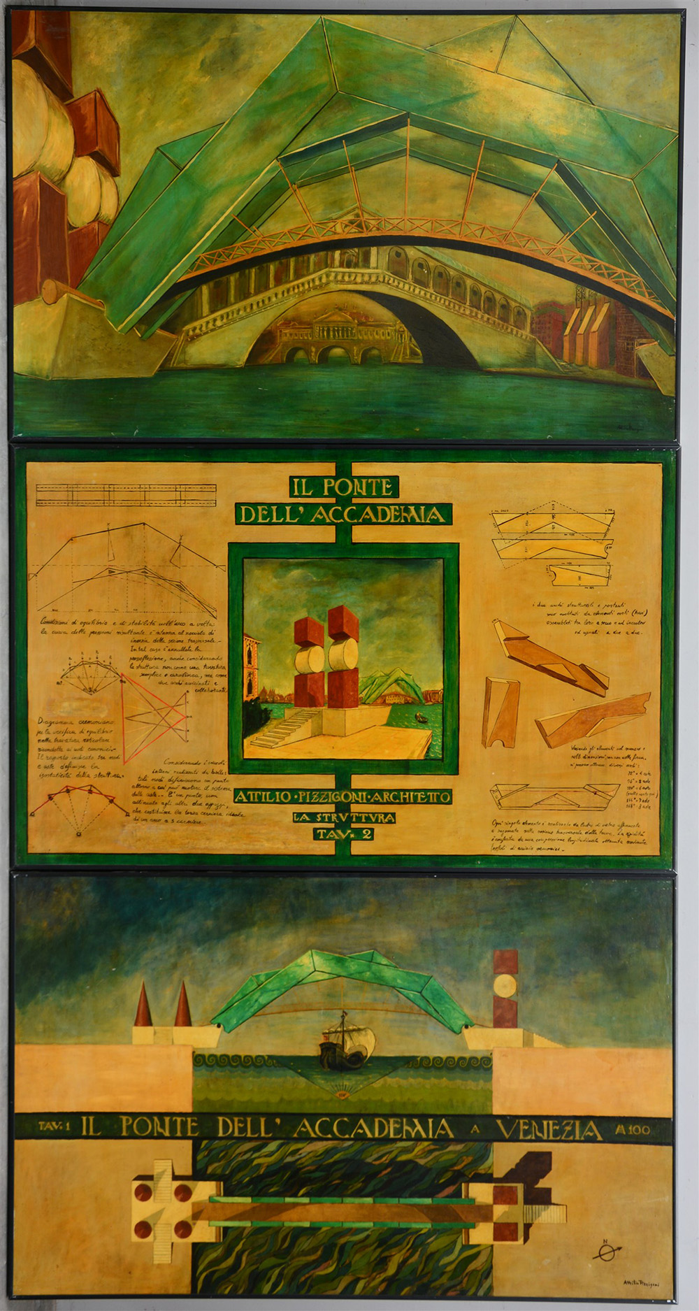 "Il ponte dell'Accademia" lotto composto da tre progetti, tecniche miste su tavola (cm 70x110) firmati, in cornici (lievi difetti)