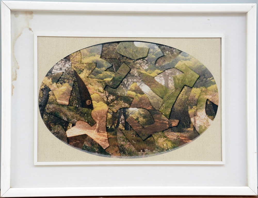 Ignoto "(S)composizione"1987, fotogramma applicato su tela (cm 35x50,5) firmato, datato, titolato e iscritto al retro, in cornice