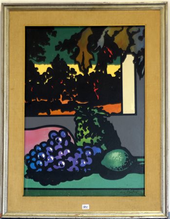 "Paesaggio e natura morta" acrilico su tela (cm 70x50) firmato in basso a destra, in cornice (difetti)
