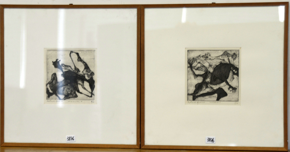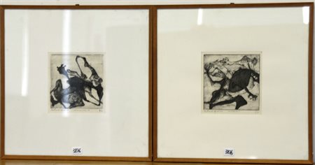 Lotto composto da due acqueforti astratte (lastra cm 14x14) firmate, titolate e numerate in basso a matita, in cornici (lievi difetti)