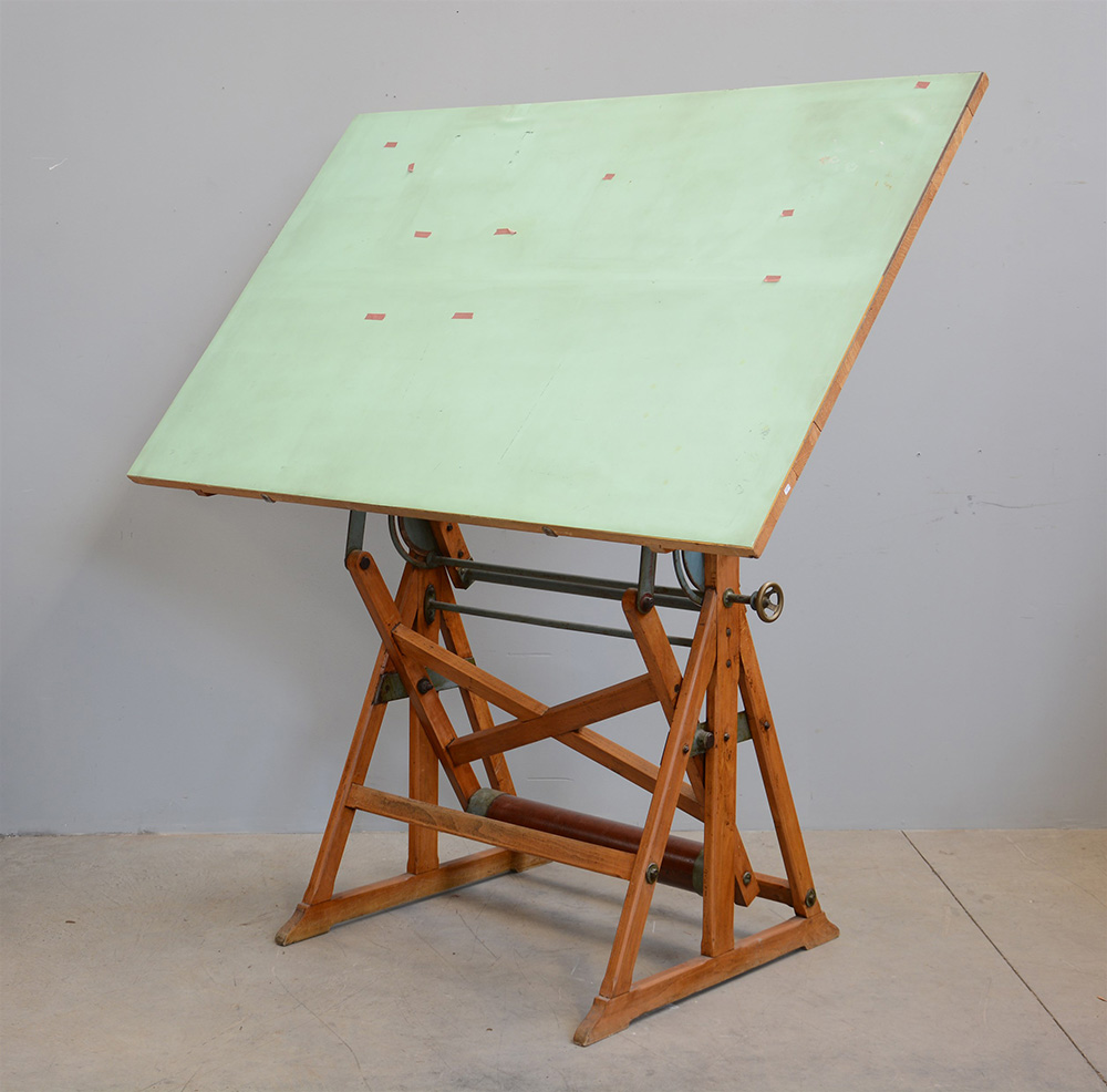 Tavolo da disegno inclinabile in legno, ferro e ottone. Anni '40 del sec. XX (cm 165x176x81)(difetti)