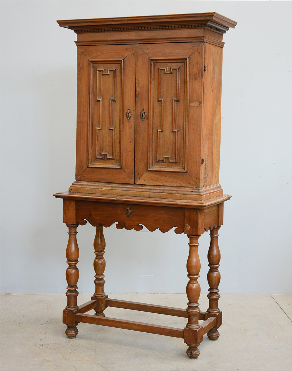 Mobile a due corpi rinascimentale in noce, parte inferiore con cassetto e...