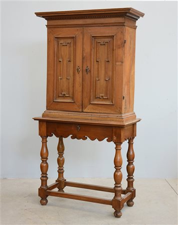 Mobile a due corpi rinascimentale in noce, parte inferiore con cassetto e gambe a rocchetto. Parte superiore con due ante pannellate (cm 92x176x45)(difetti)