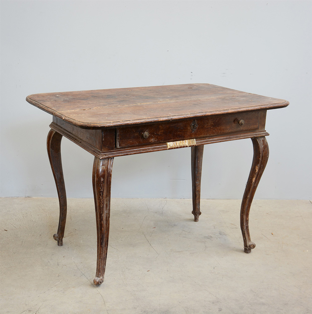 Antico tavolo da centro con cassetto sottopiano e quattro gambe mosse, secolo XVIII (cm 115x79x75)(gravi difetti)