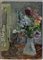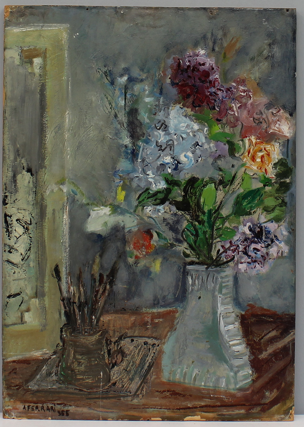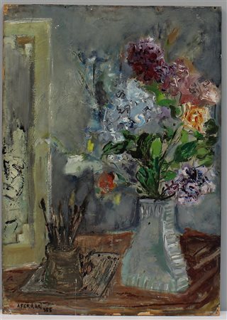 Ignoto "Natura morta con fiori e pennelli" olio su cartone pressato incollato su compensato (cm 70x50) firmato e datato 1955 in basso a sinistra (difetti)